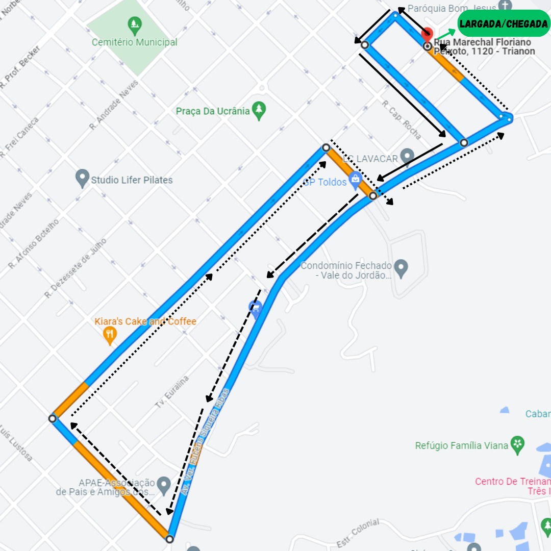 PERCURSO – Aqui – Saindo na rua Generoso de Paula Bastos (dentro do Parque do Trianon) em frente a QUADRA DE ESPORTES, direita rua Marechal Floriano Peixoto, rua 05 de Outubro, rua Vicente Machado, avenida Vereador Rubem Siqueira Ribas, rua Professor Amálio Pinheiro, rua Generoso de Paula Bastos, rua Saldanha Marinho, avenida Vereador Rubem Siqueira Ribas, rua Marechal Floriano Peixoto, esquina da rua Generoso de Paula Bastos entrando dentro do Parque do Trianon em frente a QUADRA DE ESPORTES.